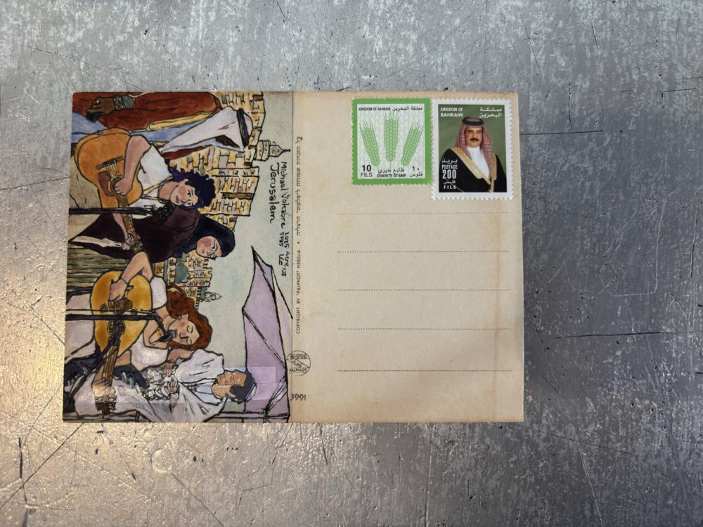 Painting in ink and watercolour on an old postcard with a panorama of Jerusalem.